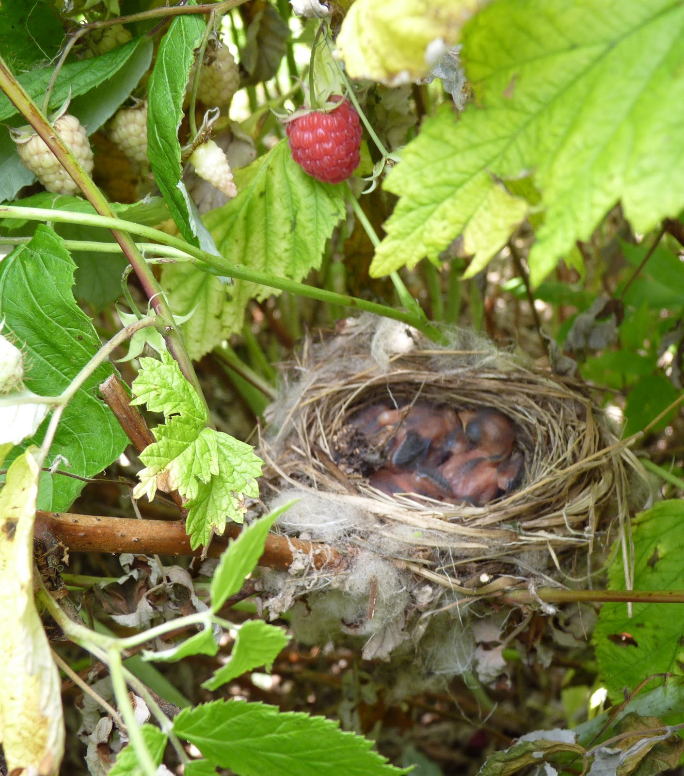 As I was returning, Glenn yelled something about seeing the baby birds. Baby birds, where? There was a small nest smack in the middle of my raspberry canes, in an area where I had already picked berries. Talk about being observant; not! Of course, since the babies are still near naked, I am unable to name the species. I will have to keep watch for that elusive mother.